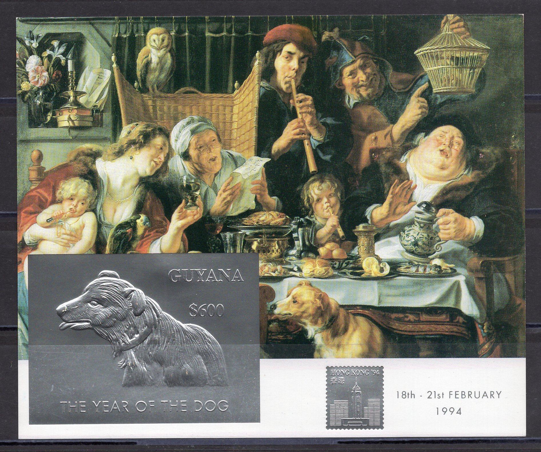 Почтовые марки. Гайана. 1994г. Живопись. Год Собаки. Бобовый король. Якоб Йорданс. Фольга. Серебро. Блок №382.