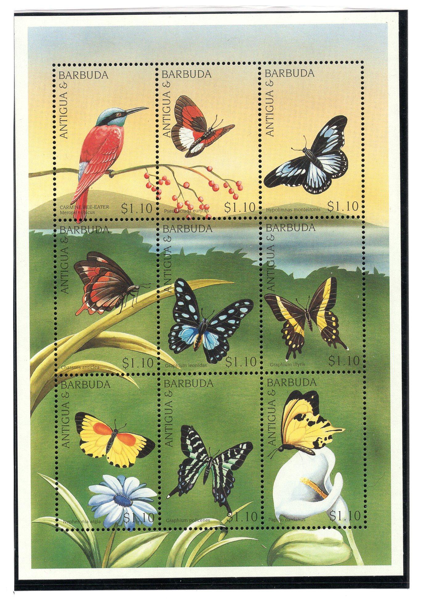 Почтовые марки. Барбуда, 1997 г. Бабочки. Птицы. №2475-2483, Бл. 360.