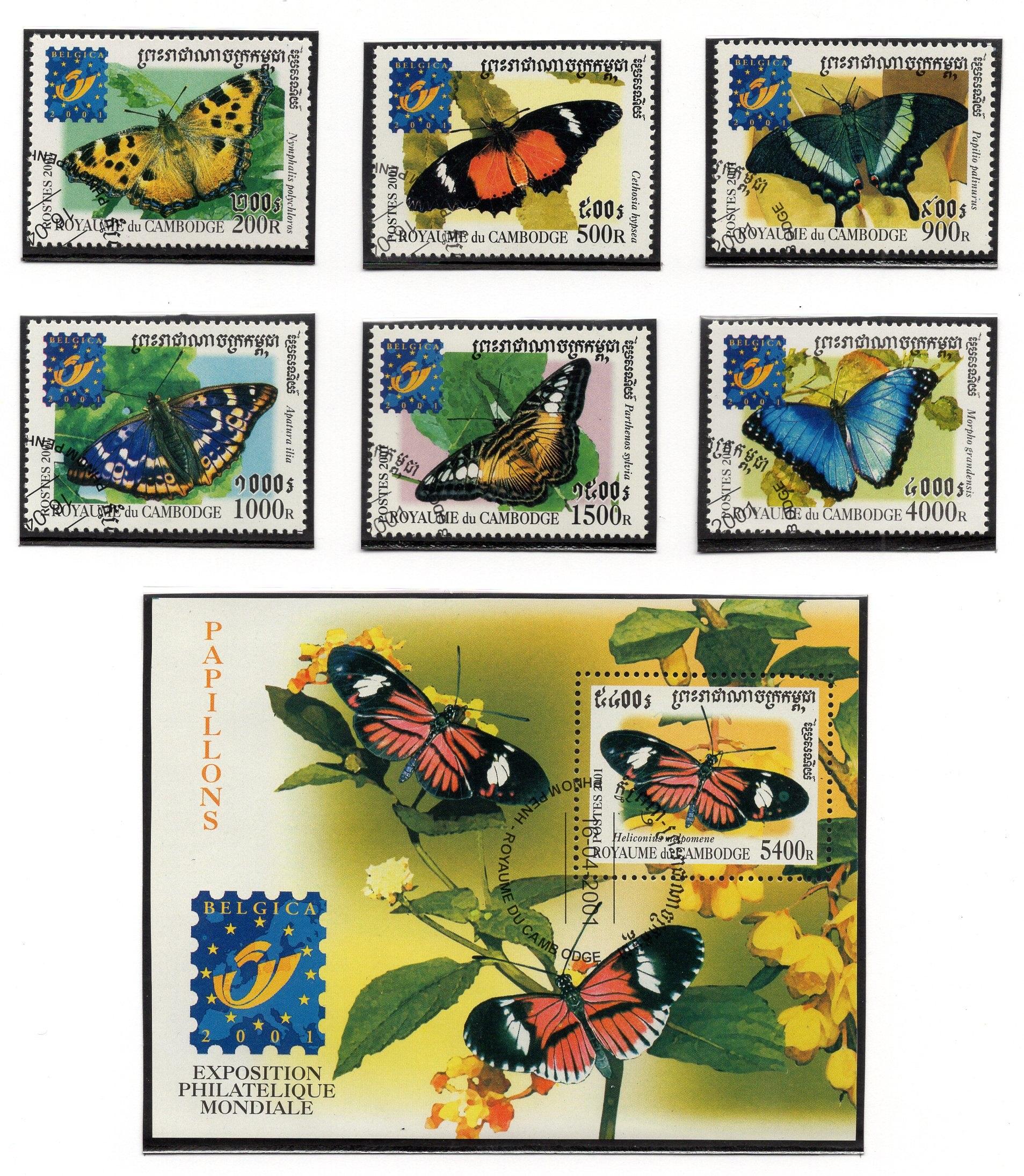 Почтовые марки. Камбоджа, 2001 г. Бабочки. №2186-2191. Бл. 283.