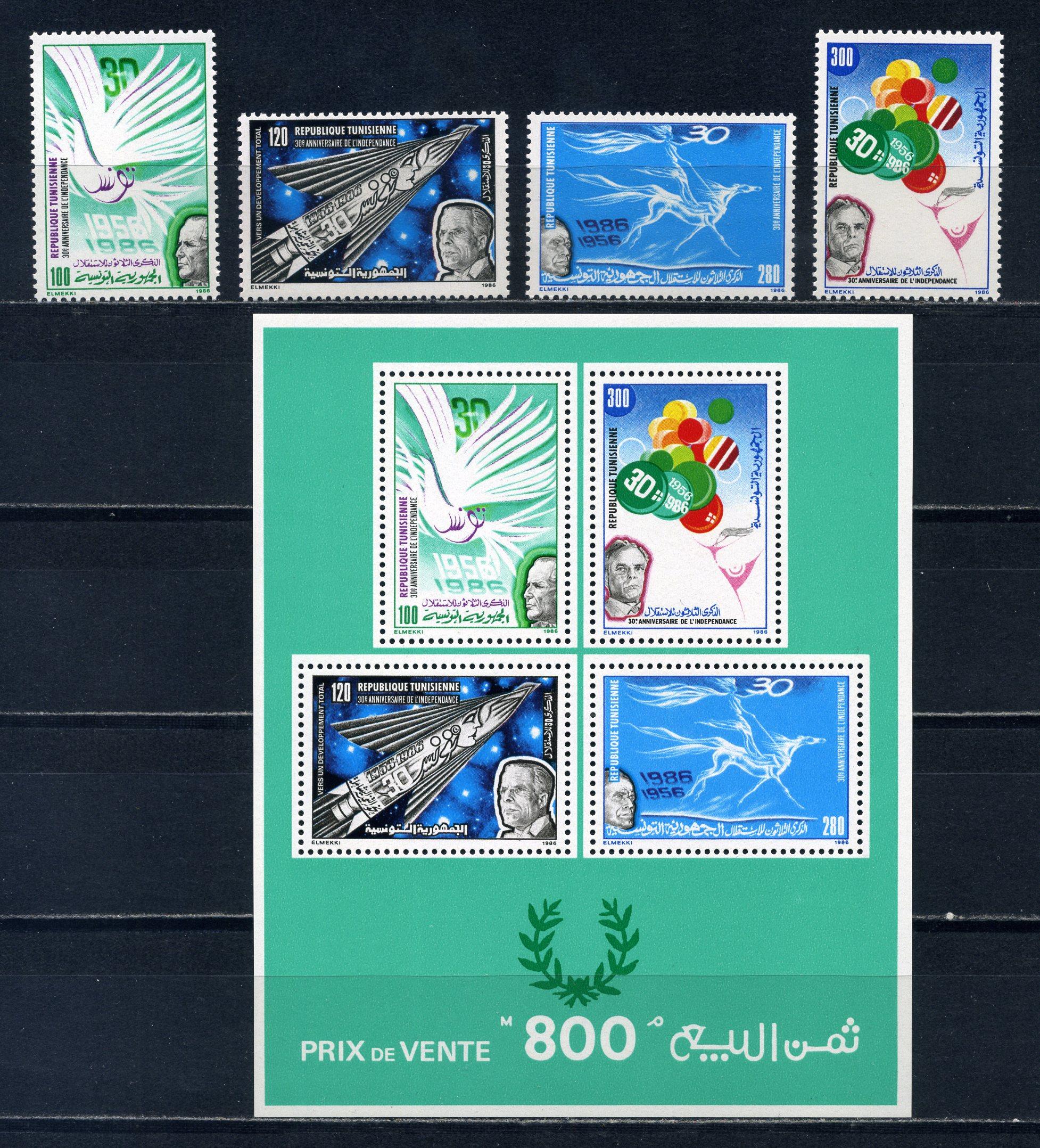 Почтовые марки. Тунис. 1986г. Годовщина независимости. №1111-1114. Блок №20.