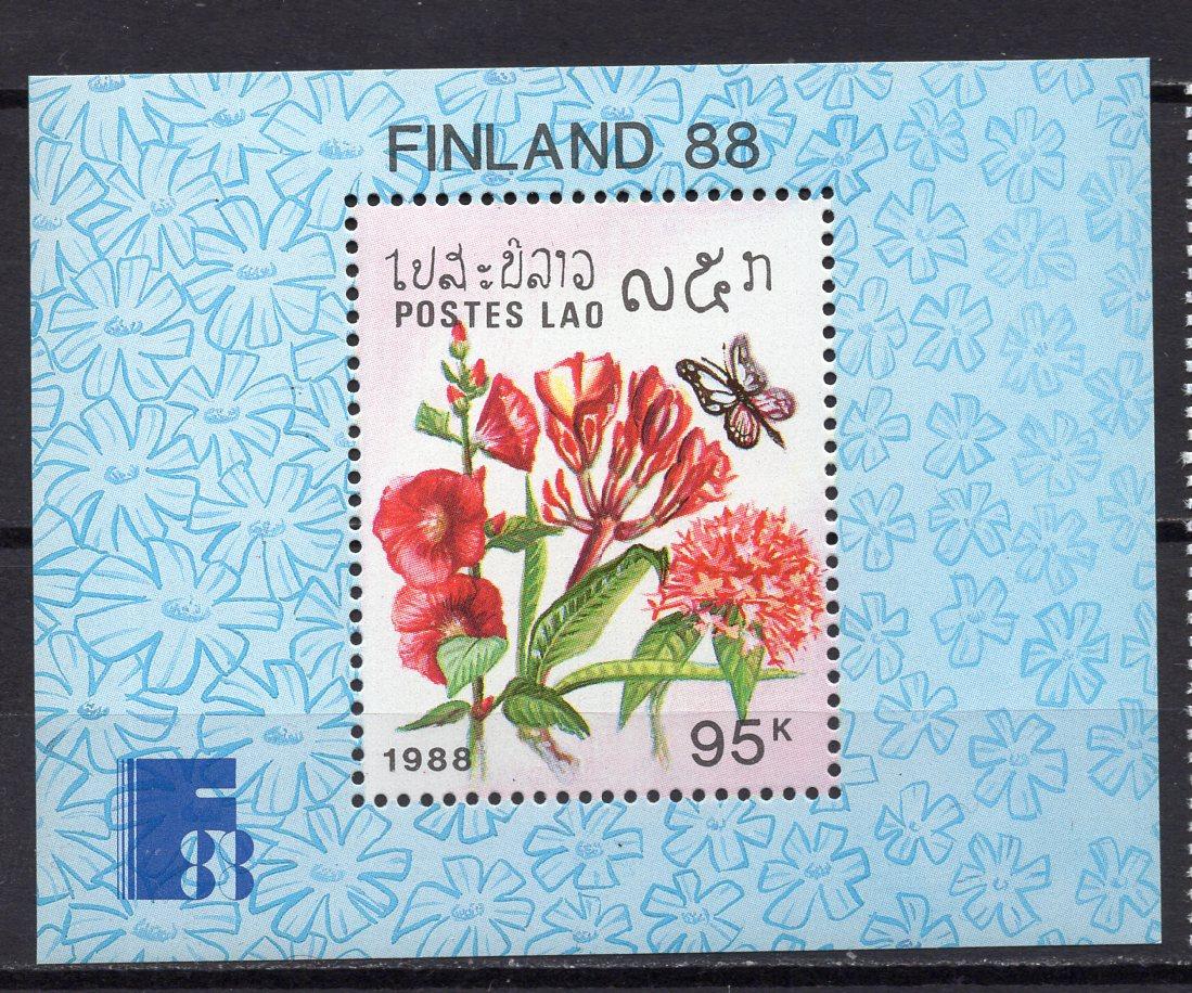 Почтовые марки. Лаос, 1988 г. Бабочки. Цветы. Бл. 124