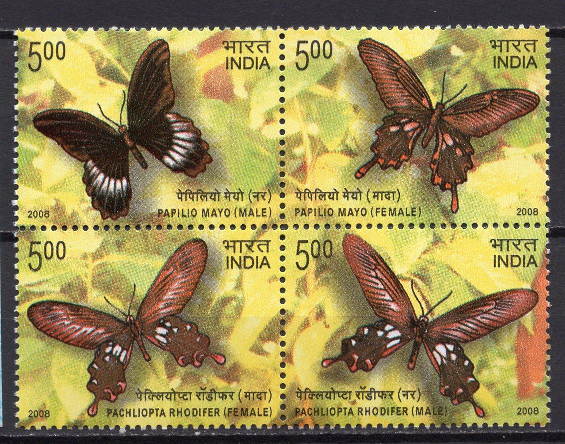 Почтовые марки. Индия, 2008 г. Бабочки. №2257-2260. Сцепка.