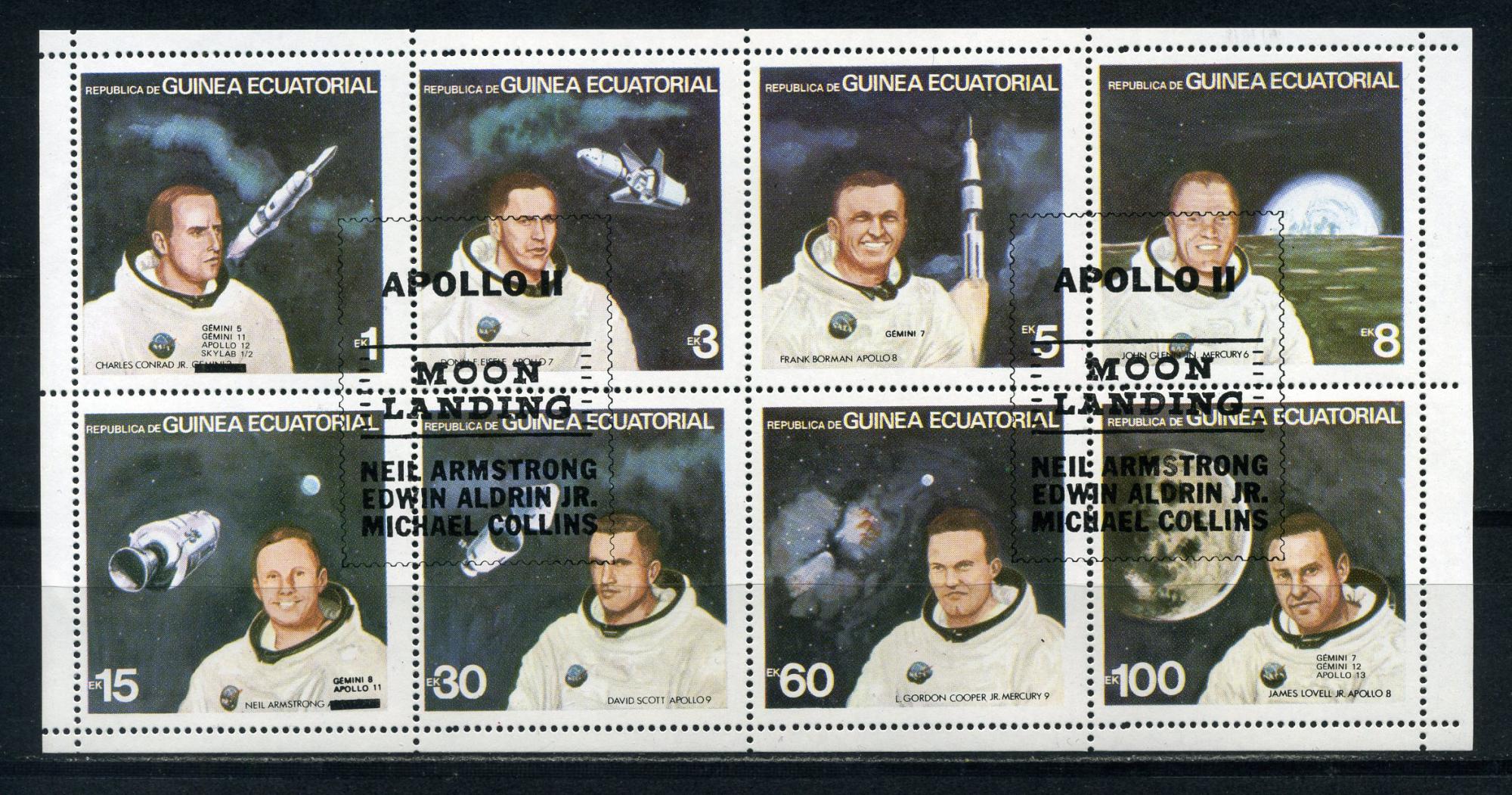 Почтовые марки. Экваториальная Гвинея. 1978г. Космос. Надпечатка "APOLLO 11". №1411-1418.