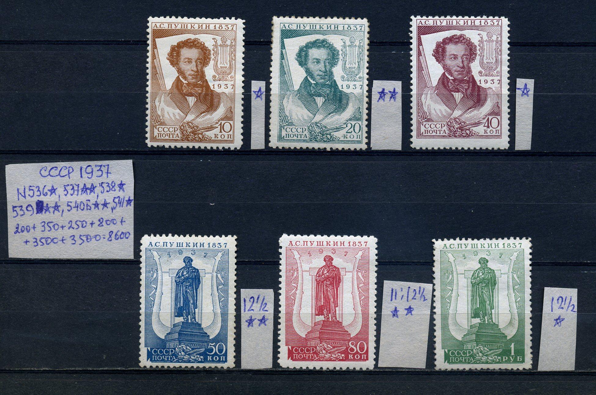 Почтовые марки. СССР 1937 г. А.С. Пушкин. №536-539,540Б,541 (Кат.: 8600р.)
