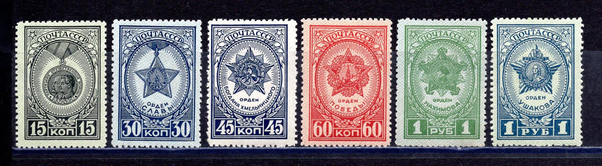 Почтовые марки. СССР. 1945г. Ордена и Медали. №952-957 (№953, №956 Б/К).