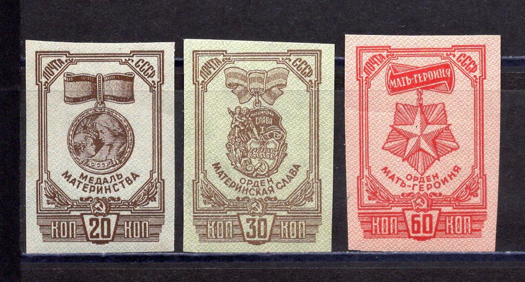 Почтовые марки. СССР. 1945г. Ордена Материнства. №981 (чист), №982-983 (чист. с накл).