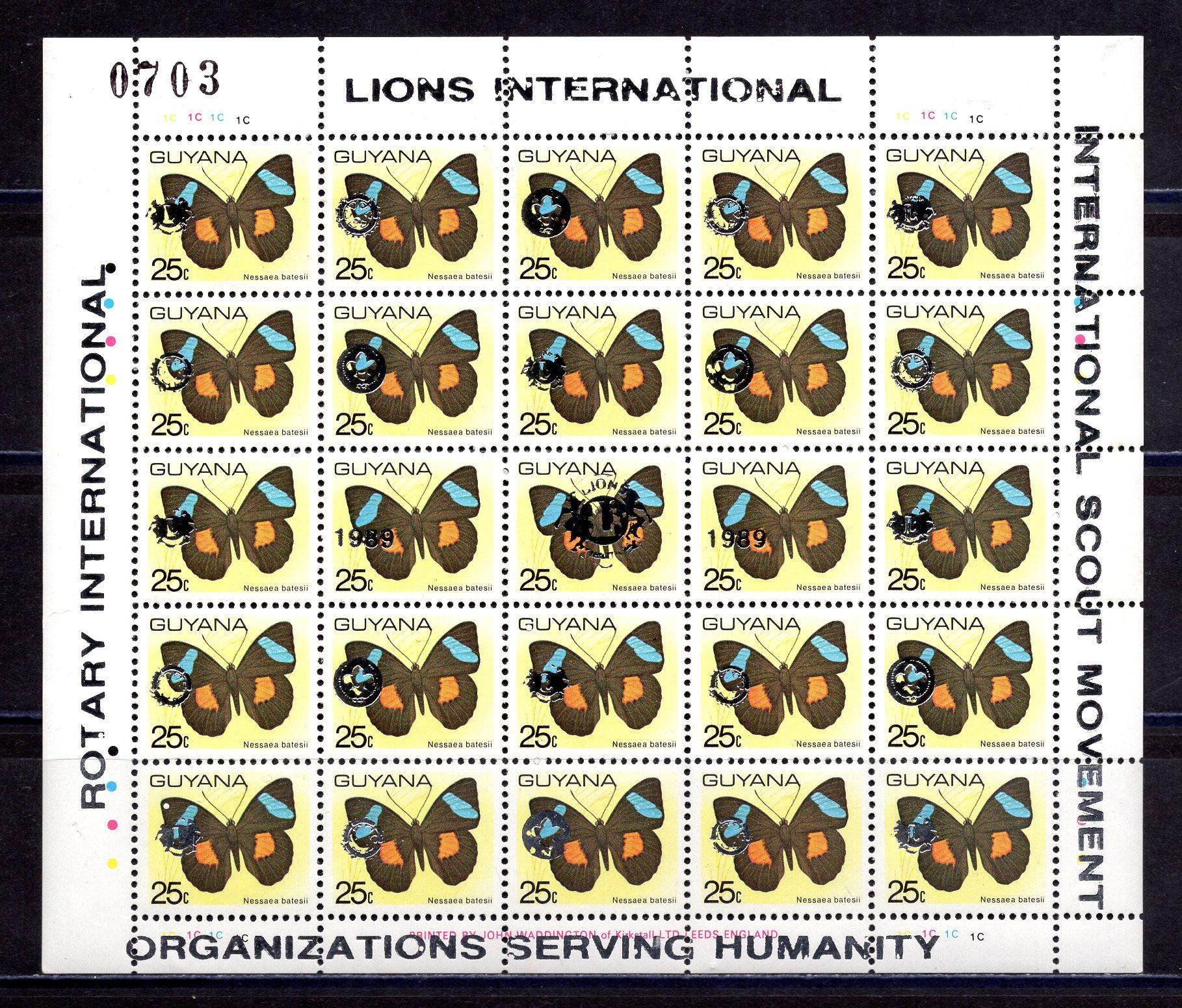 Почтовые марки. Гайана. 1989г. Бабочки. Лионский Клуб. Надпеч. МЛ. №2617-2621.