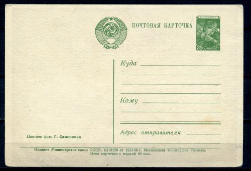 Почтовая карточка. СССР 1958 г. Цветное фото Г. Самсонова.