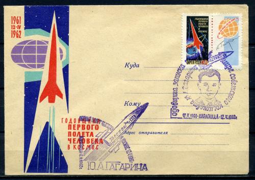 Конверт с маркой и СГ. СССР 1962 г. Годовщина 1-го полета человека в космос. КЗ.