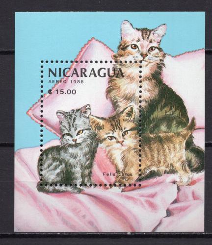 Почтовые марки. Никарагуа, 1988 г. Кошки с котятами. Бл. 179.