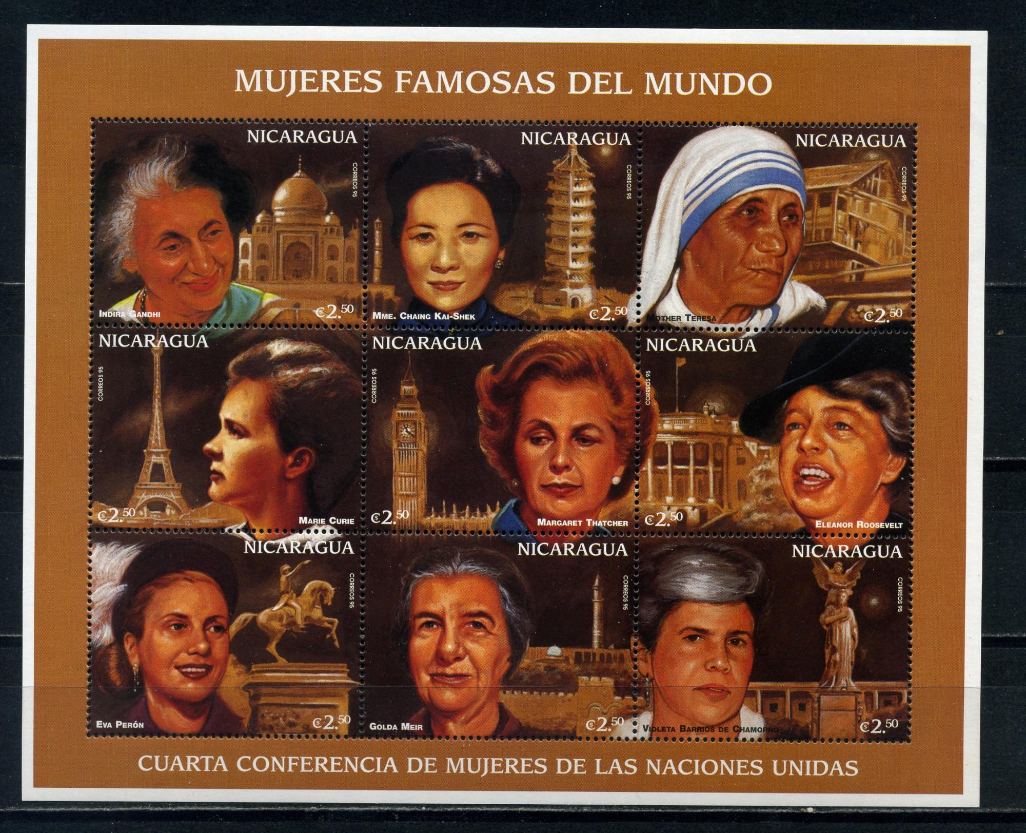 Почтовые марки. Никарагуа. 1996г. Выдающиеся женщины. Ганди. Тэтчер. Рузвельт. Тереза. №3742-3750.