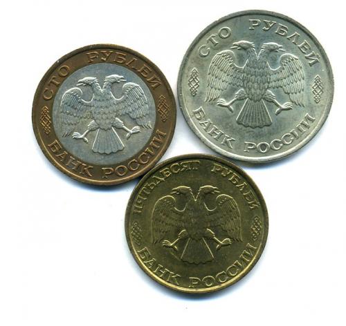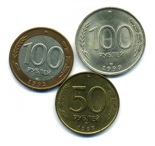 Монеты России. 50, рублей, 100 рублей ГКЧП. 1992-1993 г. 3 шт.