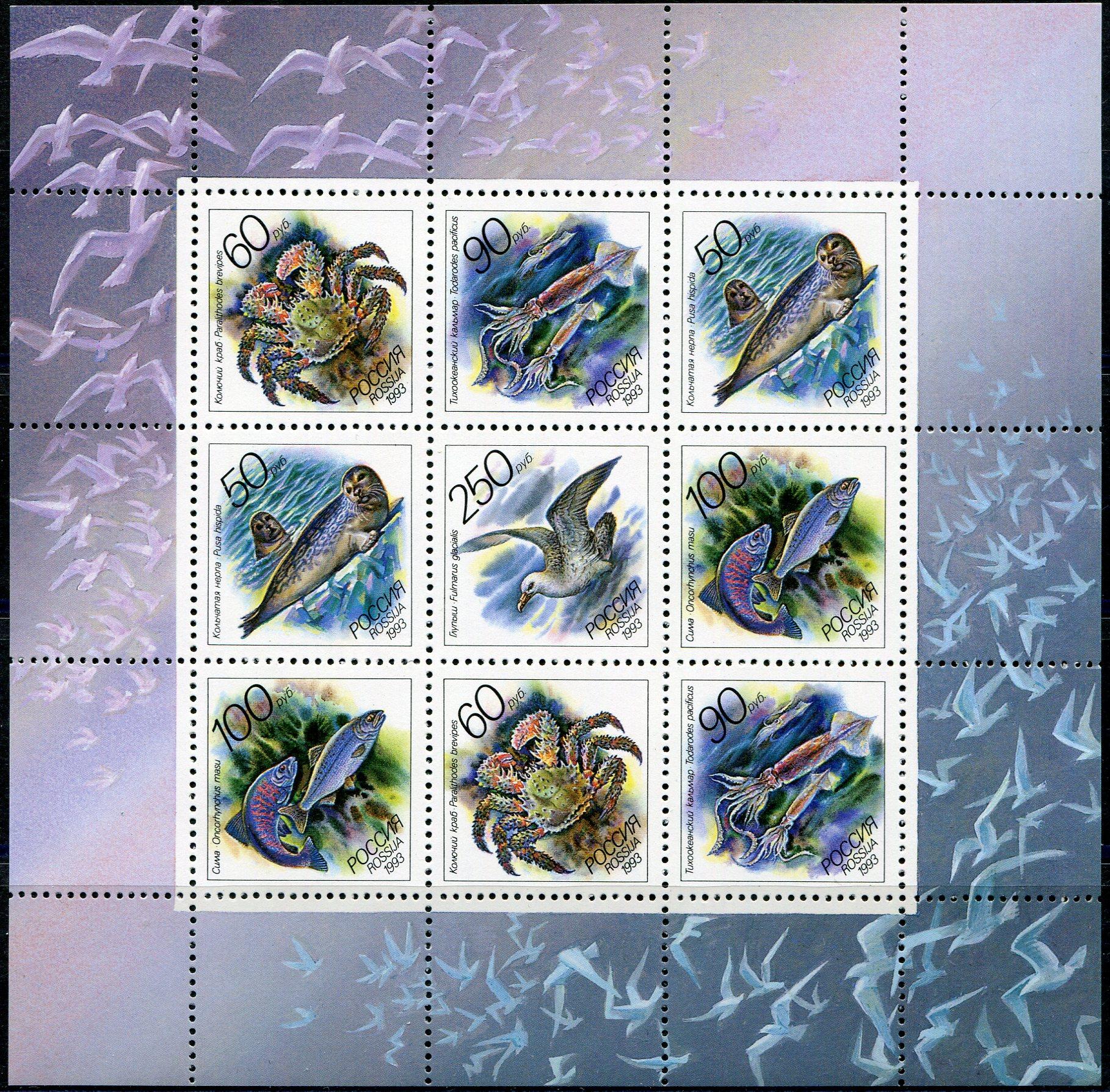 Почтовые марки. Россия. 1993г. Животные морей. МЛ. №104-108.