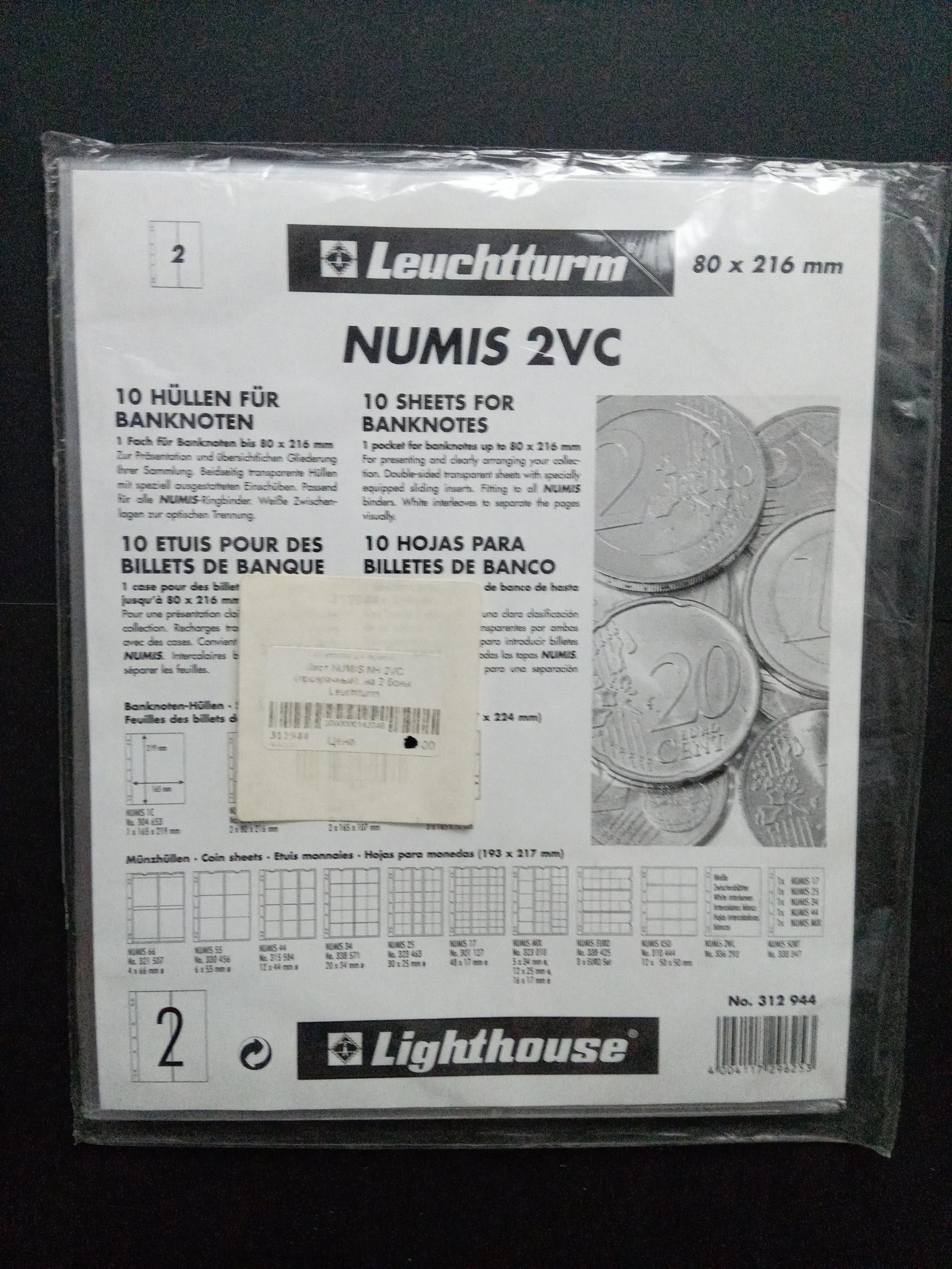 Лист NUMIS 2VC (прозрачный) на 2 боны. LEUCHTTURM. В упаковке 10 шт. Новые.
