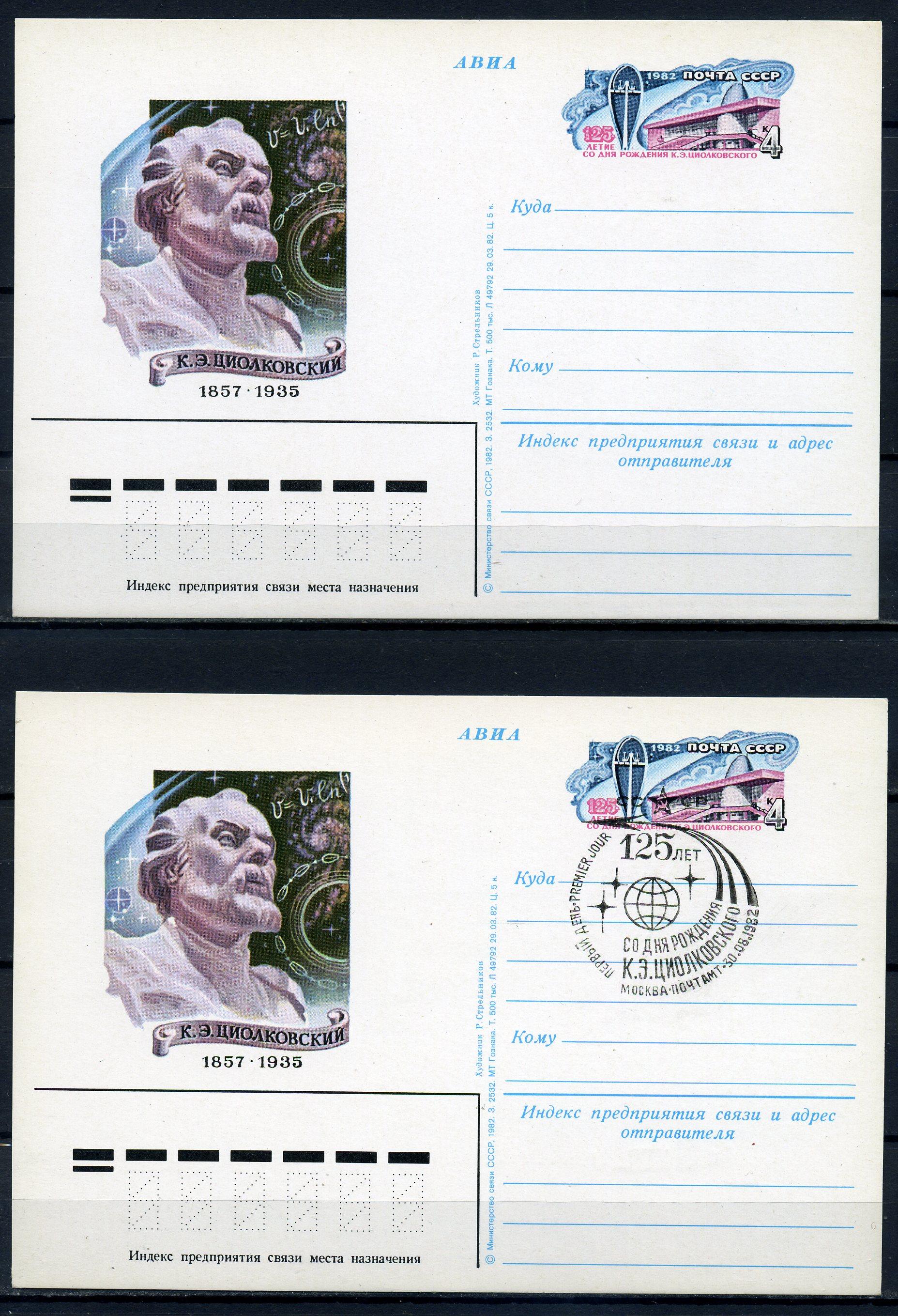 Почтовая карточка с ОМ. Чист. + СГ. СССР 1982 г. 125 лет со ДР К.Э. Циолковского.