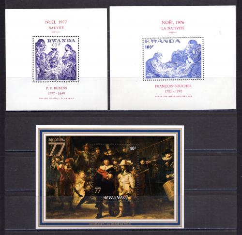 Почтовые марки. Руанда. 1976-1977г. Живопись. Рубенс. Рембрандт. Буше. Блок №73, №76, №83. (См.сост.)