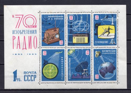 Почтовый блок. СССР 1965 г. № 3207. 70-летие изобретения радио (Кат.: 250р.).