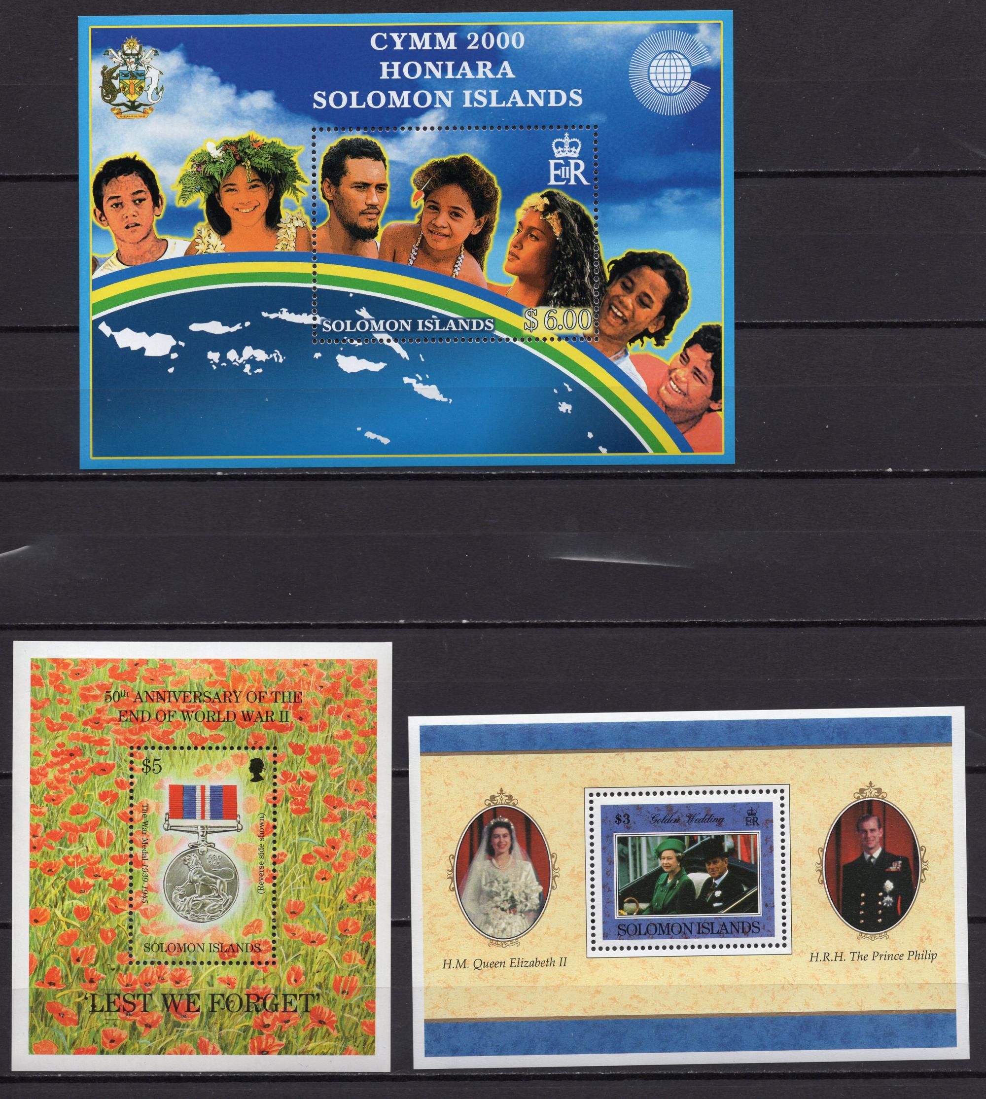 Почтовые марки. Соломоны. 1995-1997г. Елизавета II и принц Филипп. Фестиваль молодежи. Вторая мировая. Медали. Цветы. № Бл. 42, 49, 60.