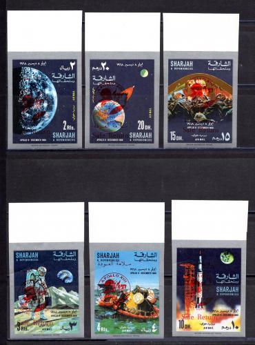 Почтовые марки. Шарджа. 1972г. Космос. Аполло-13. Надпечатка. №1136В-1141В. Беззубц. (См.сост.)