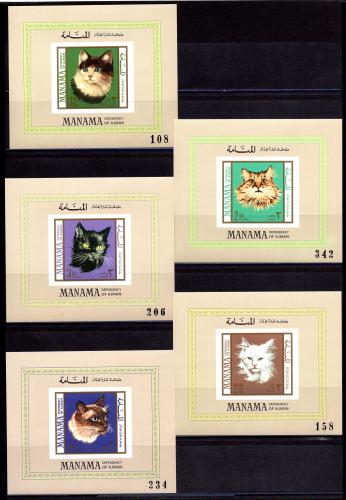 Почтовые марки. Манама. 1968г. Породы кошек. Люкс-Блоки. №107в-111в. Беззубц.