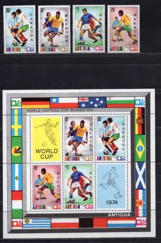 Почтовые марки. Барбуда, 1974 г. №178-181. Бл.9. Футбол. Надпечатка.