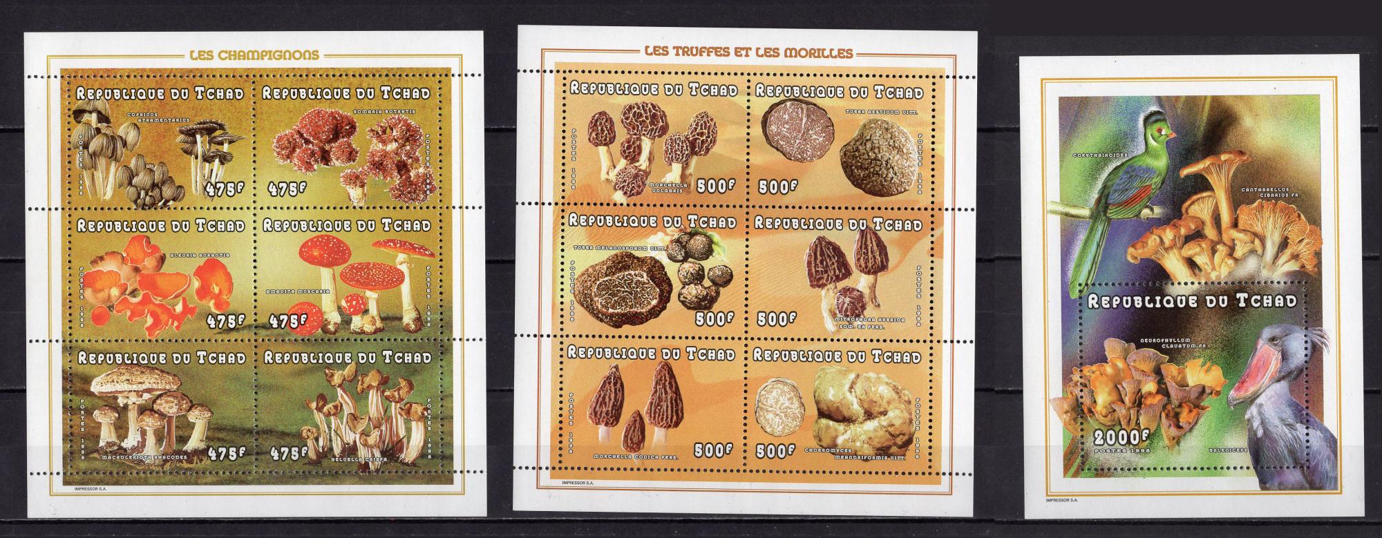 Почтовые марки. Чад, 1998 г. Грибы. Птицы. №1727 -1738 МЛ, Бл. 284. (Mi 29.50 €)