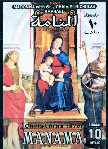 Почтовые марки. Манама. 1970. Рождество. Рафаэль. Блок №91.