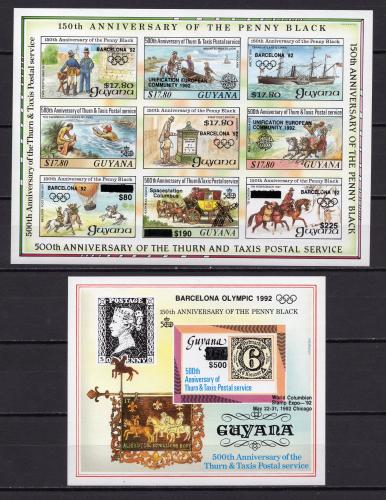 Почтовые марки. Гайана. 1990г. Открытие Америки. Олимпиада. Надпечатка чёрная. №3126-3134. Блок №85 БЕЗЗ.