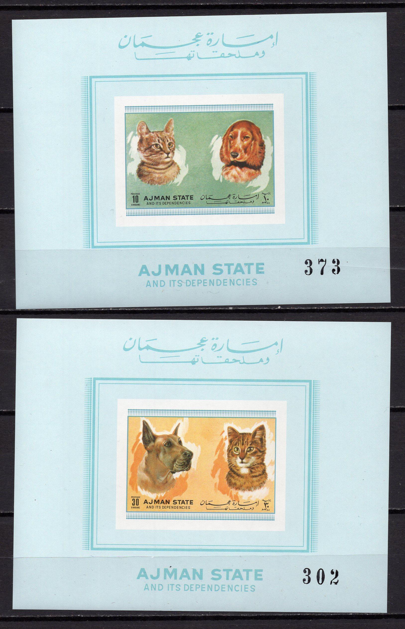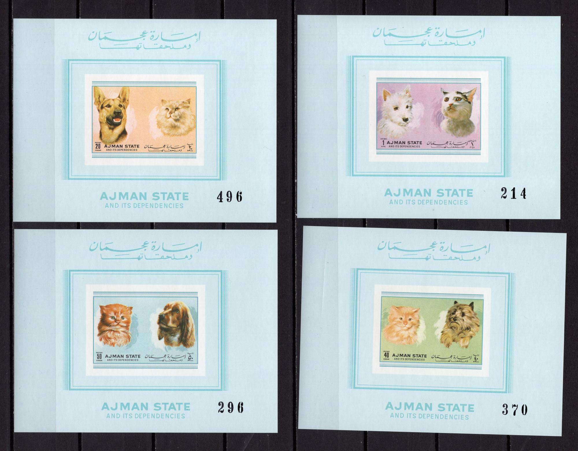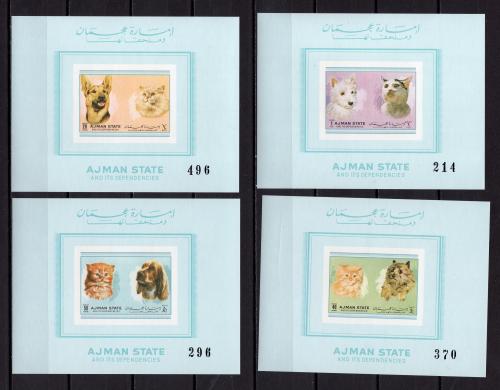 Почтовые марки. Аджман, 1972 г. Коты и собаки. Люкс-блоки. (тираж виден по номеру). №1762-1766.