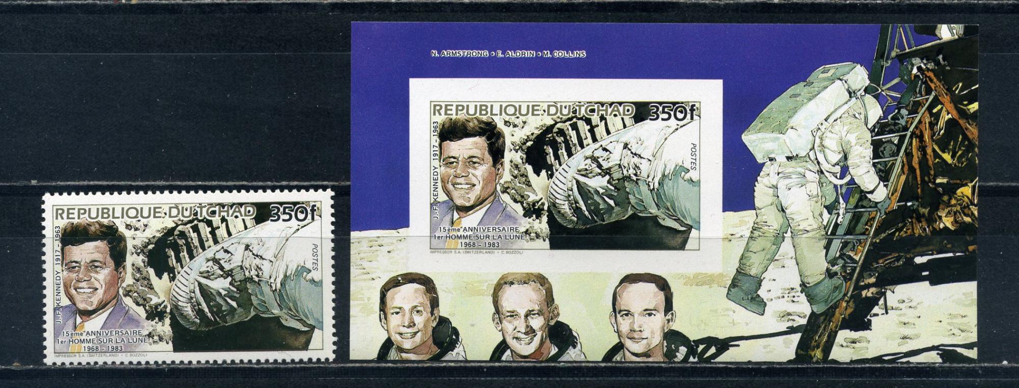 Почтовые марки. Чад. 1982г. Космос. Человек на Луне. Кеннеди. №1047. Блок №218В.(беззубц.) (Мi : 16.00 Евро)