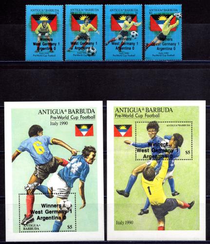 Почтовые марки. Антигуа и Барбуда. 1990г. Чемпионат мира по футболу FIFA 1990 - Италия - Победители. №1418-1421, Блок №187-188.
