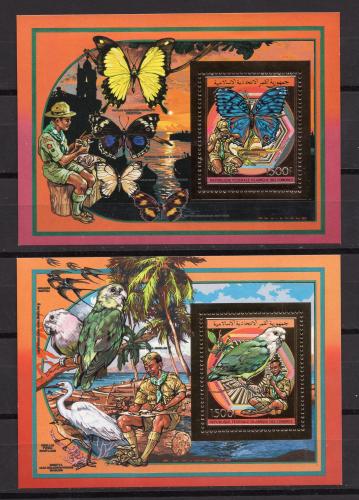 Почтовые марки. Коморы, 1989 г. Бабочки. Птицы. Скауты. Бл. 293А, 294А. Фольга. Золото. (48,0 е)