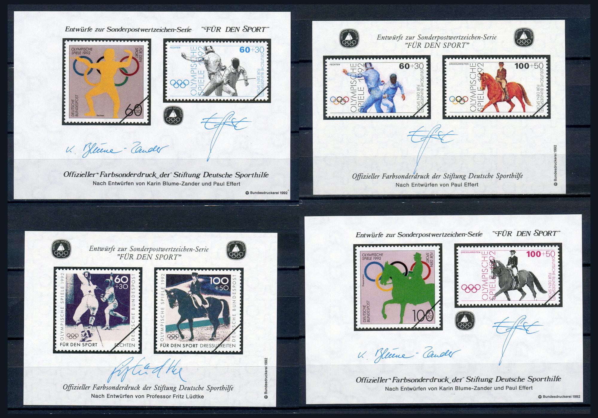 Эскизы для выпусков почтовых марок. ФРГ 1992 г. Спорт. Офиц. цветная печать Фонда Dtutsche Sporthilfe с автографами (!) дизайнеров.