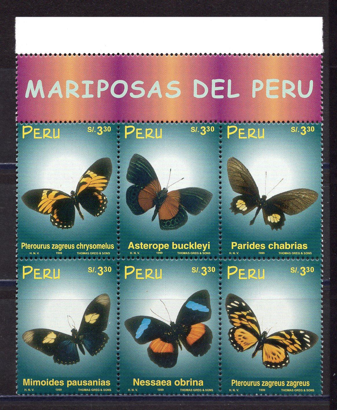Почтовые марки. Перу. 1999г. Бабочки. №1713-1718.