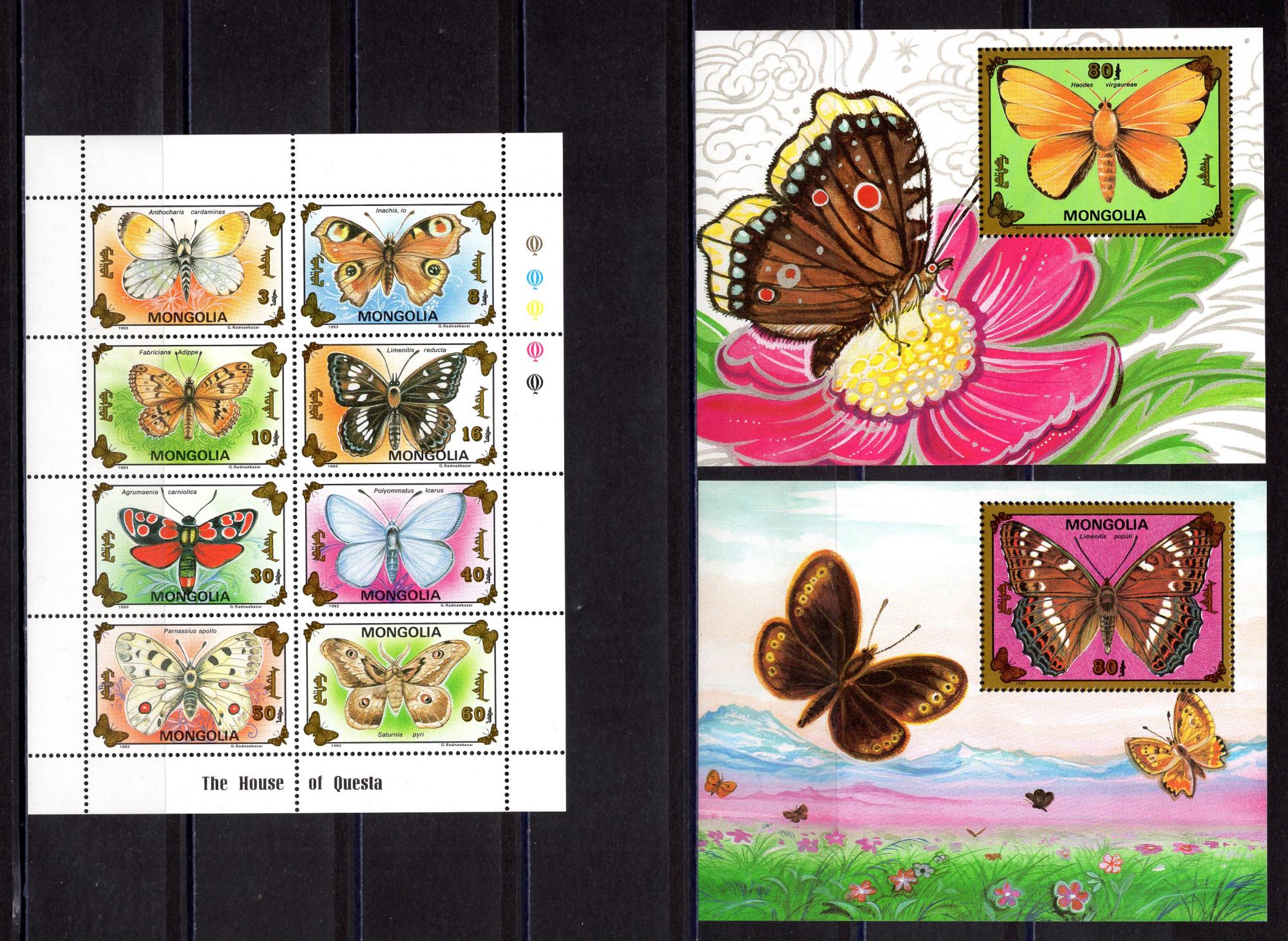Почтовые марки. Монголия. 1993г. Бабочки. №2455-2462, Блок №217-218.