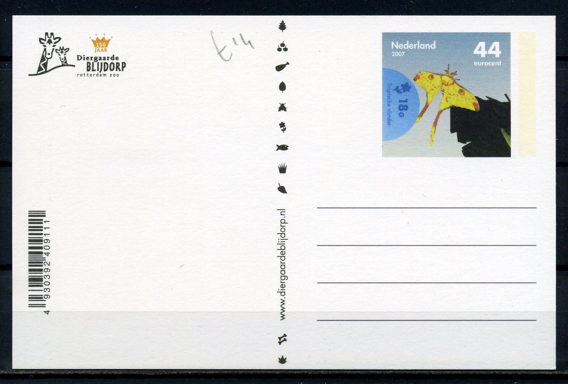 Почтовая карточка. Нидерланды 2007 г. бабочки.