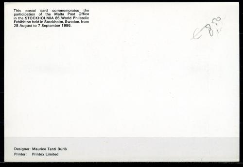 Почтовая открытка посвященная участию Мальты во всемирной филателистической выставкае в Стокгольме 1986 г.