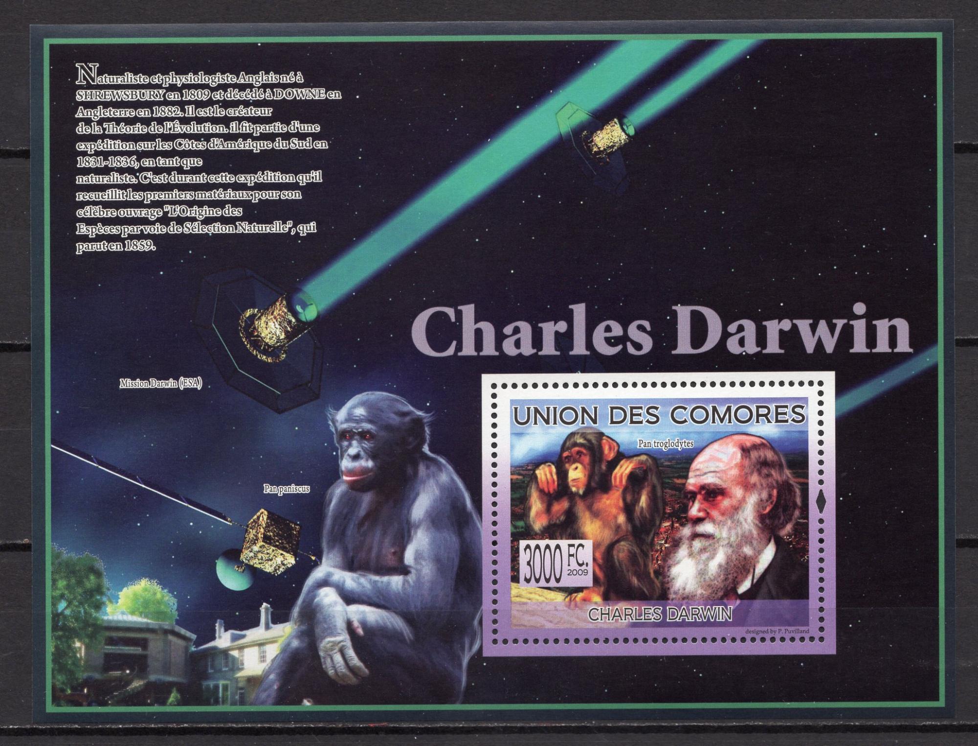 Почтовые марки. Коморы. 2009г. Чарльз Дарвин. Шимпанзе. Космос. Блок №490.