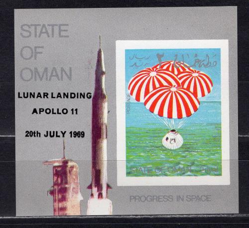 Почтовые марки. Оман. 1969г. Космос. Аполло-11. Надпечатка. Блок. Беззубц. (кат.Weebau)