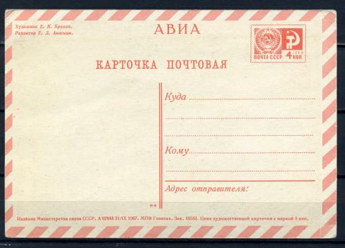 Почтовая карточка АВИА. СССР 1967 г. С Праздником Победы!