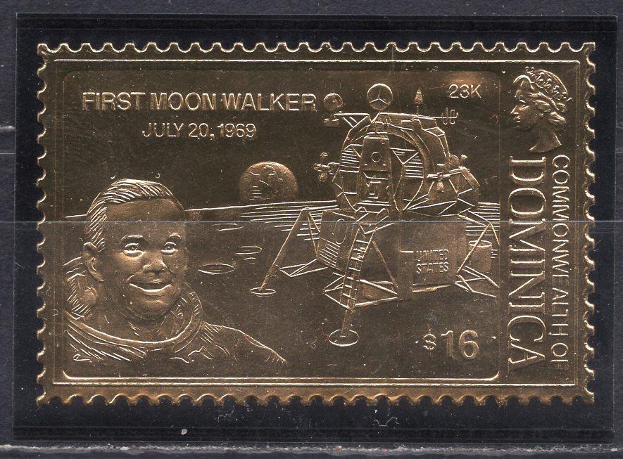 Почтовые марки. Почтовые марки. Доминика 1980. Космос. Первый человек на Луне. Фольга. Золото. № 26 (кат. Weebau).