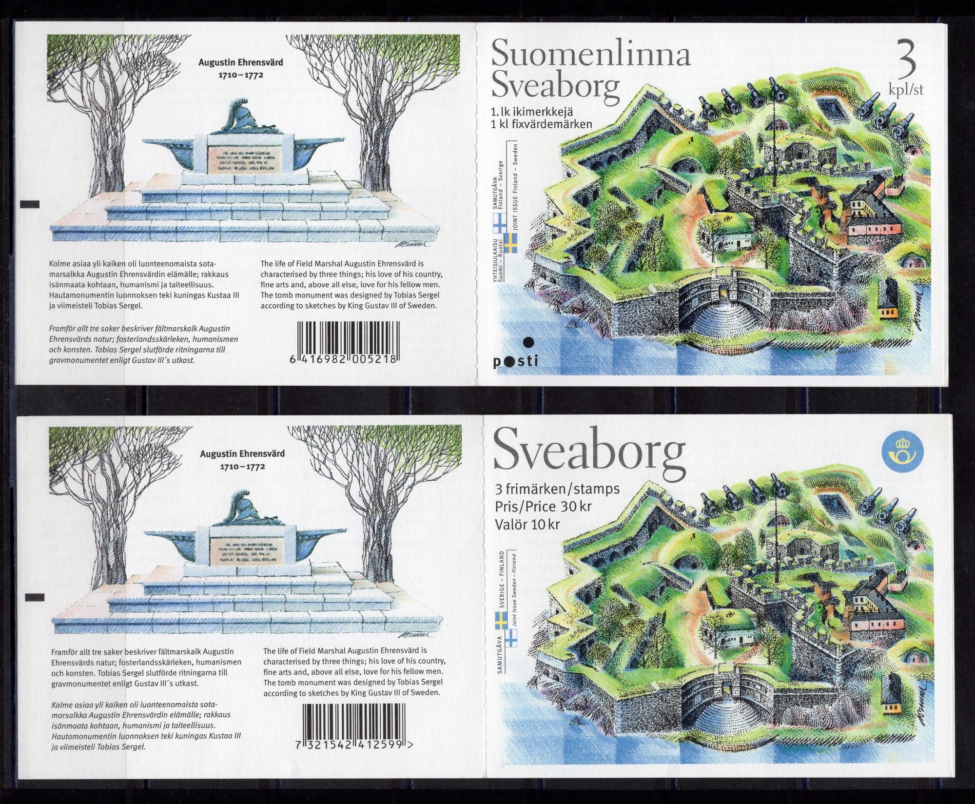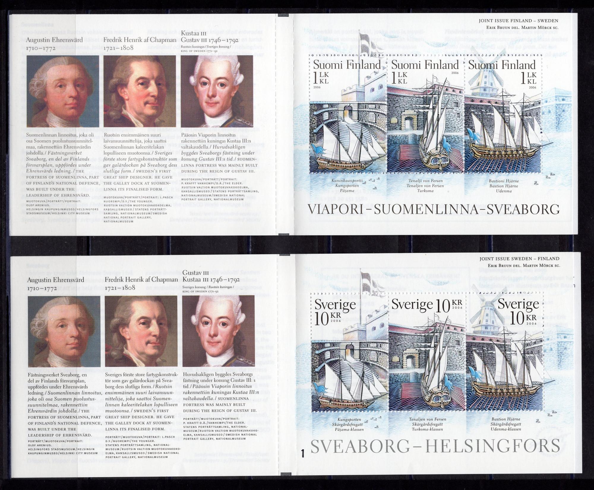 Почтовые марки. Финляндия-Швеция. 2006г. Крепость Свеаборг. Парусники. Совместный выпуск. №1798-1800, №2528-2530. Буклеты.