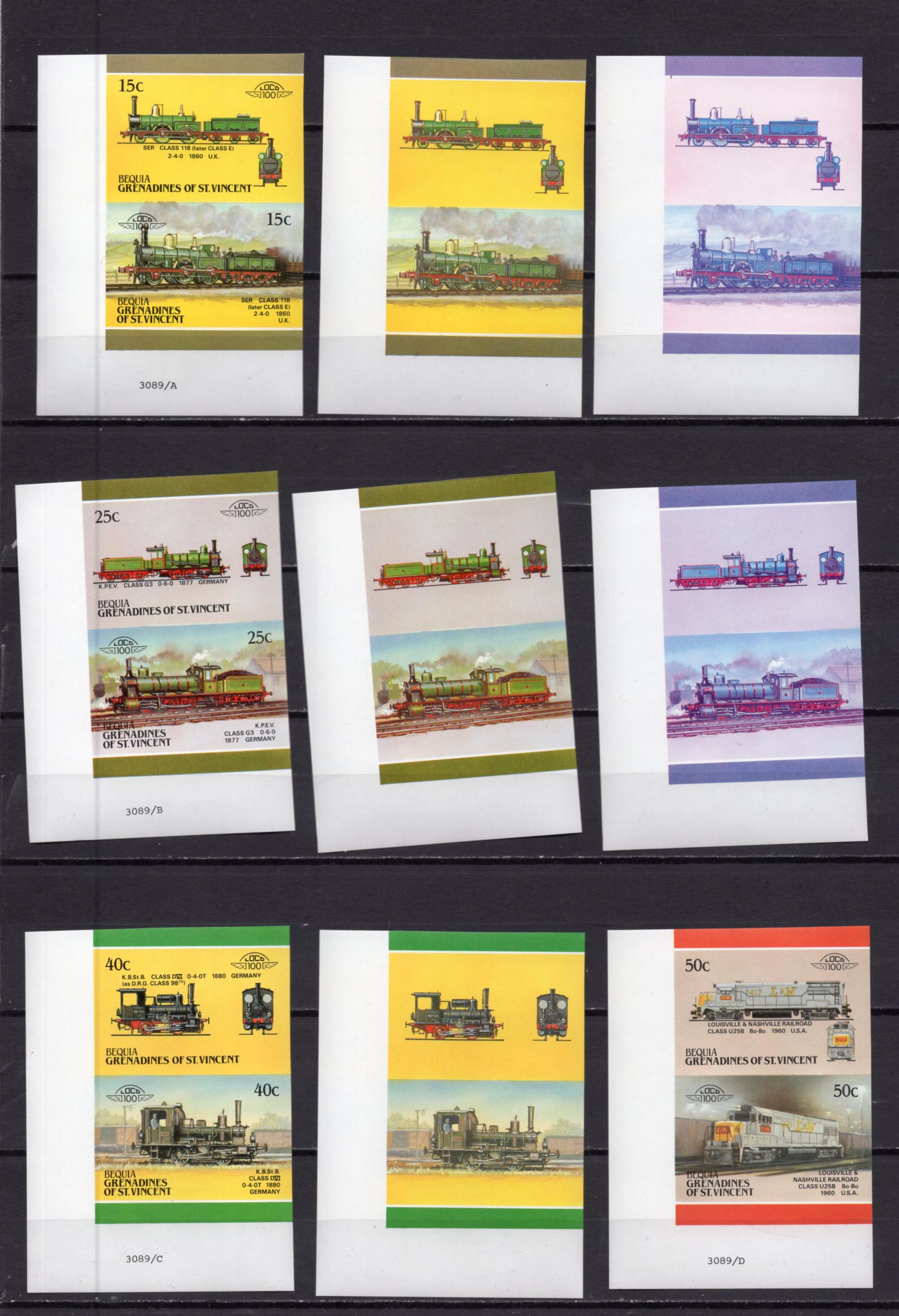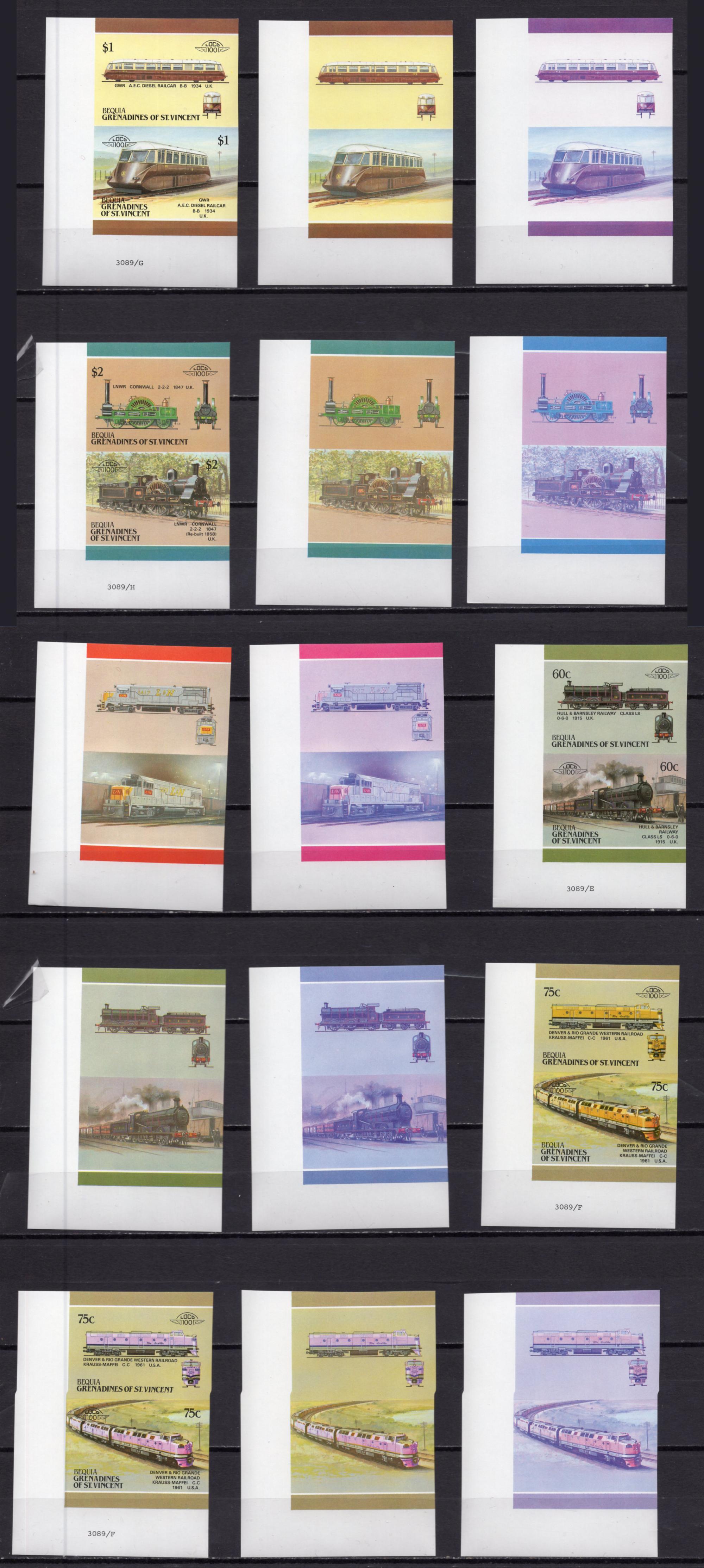 Почтовые марки. Гренадины, Сент-Винсент, Бекия. 1987 г. Локомотивы. ПРОБЫ. БЕЗЗ. 16 марок (8 пар) №238-253.