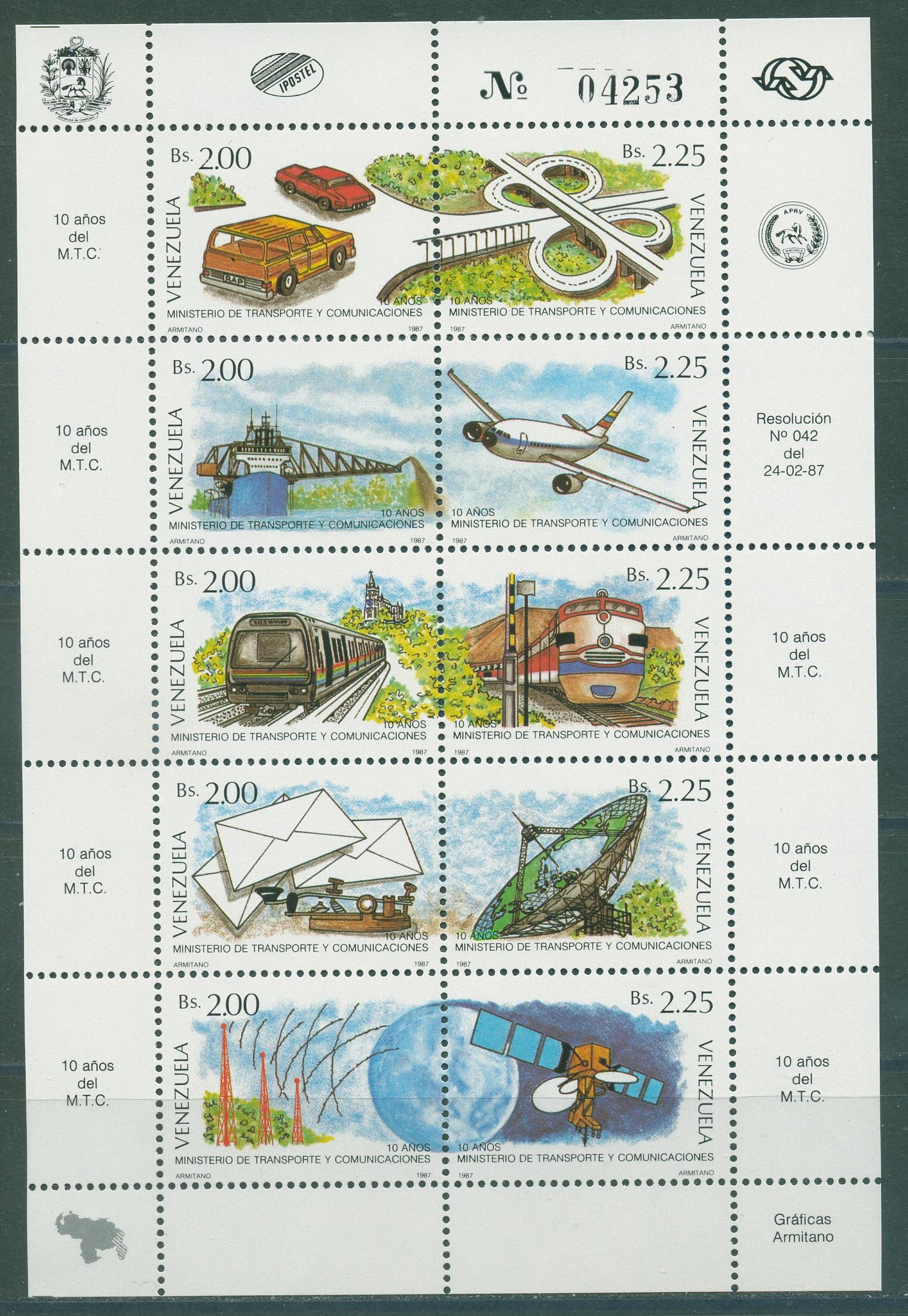 Почтовые марки. Венесуэла. 1987. Космос. Транспорт. Локомотивы. Самолёты. МЛ. № 2442-2451 (Mi: 20.00 Евро)