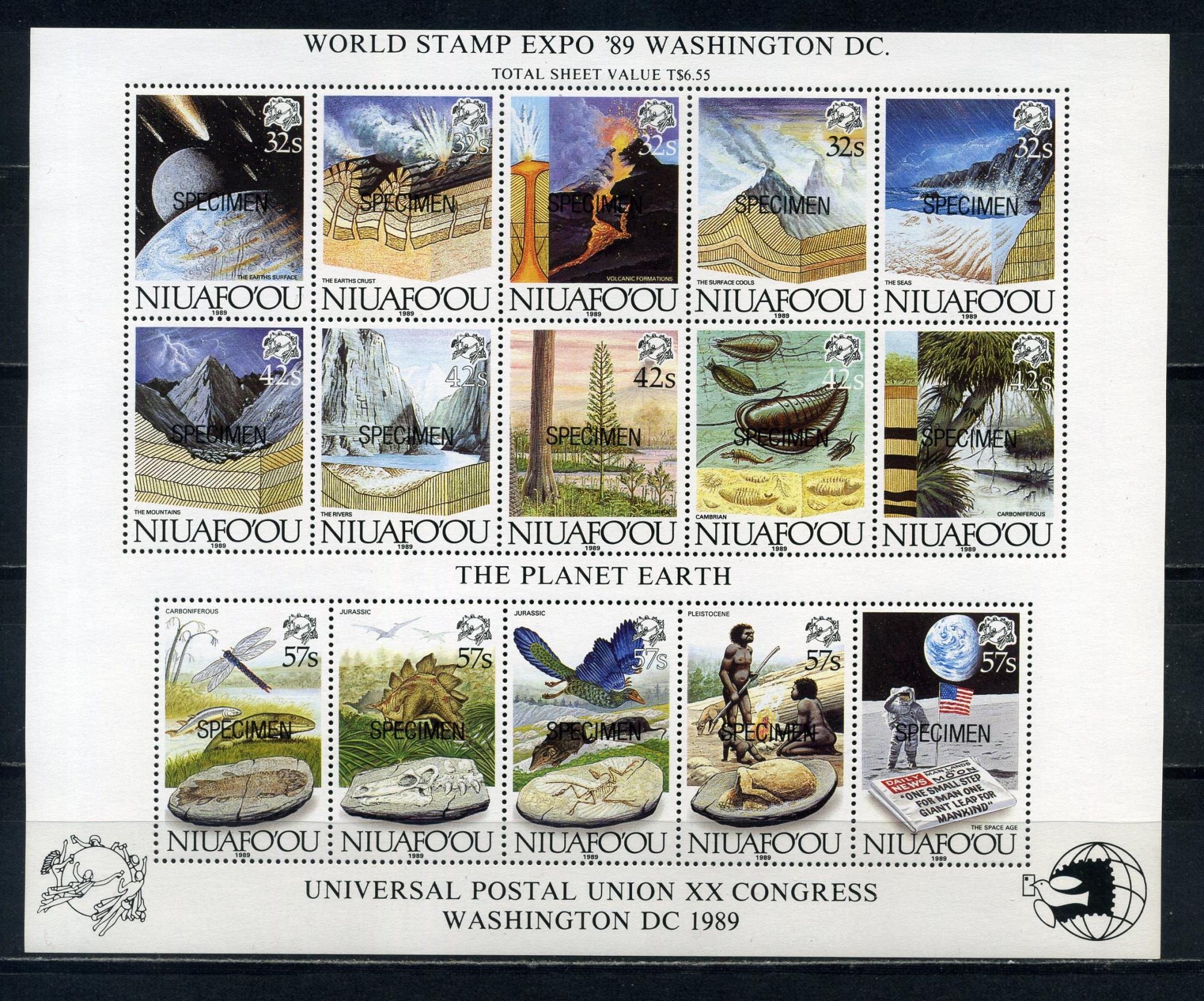Почтовые марки. Ниуафо'оу. 1989г. Экспо-89. Природные явления. Животные. Космос. Надпечатка SPECIMEN. Блок №8.