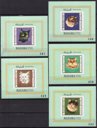 Почтовые марки. Манама. 1968г. Породы кошек. Люкс-Блоки. №107в-111в. Беззубц.