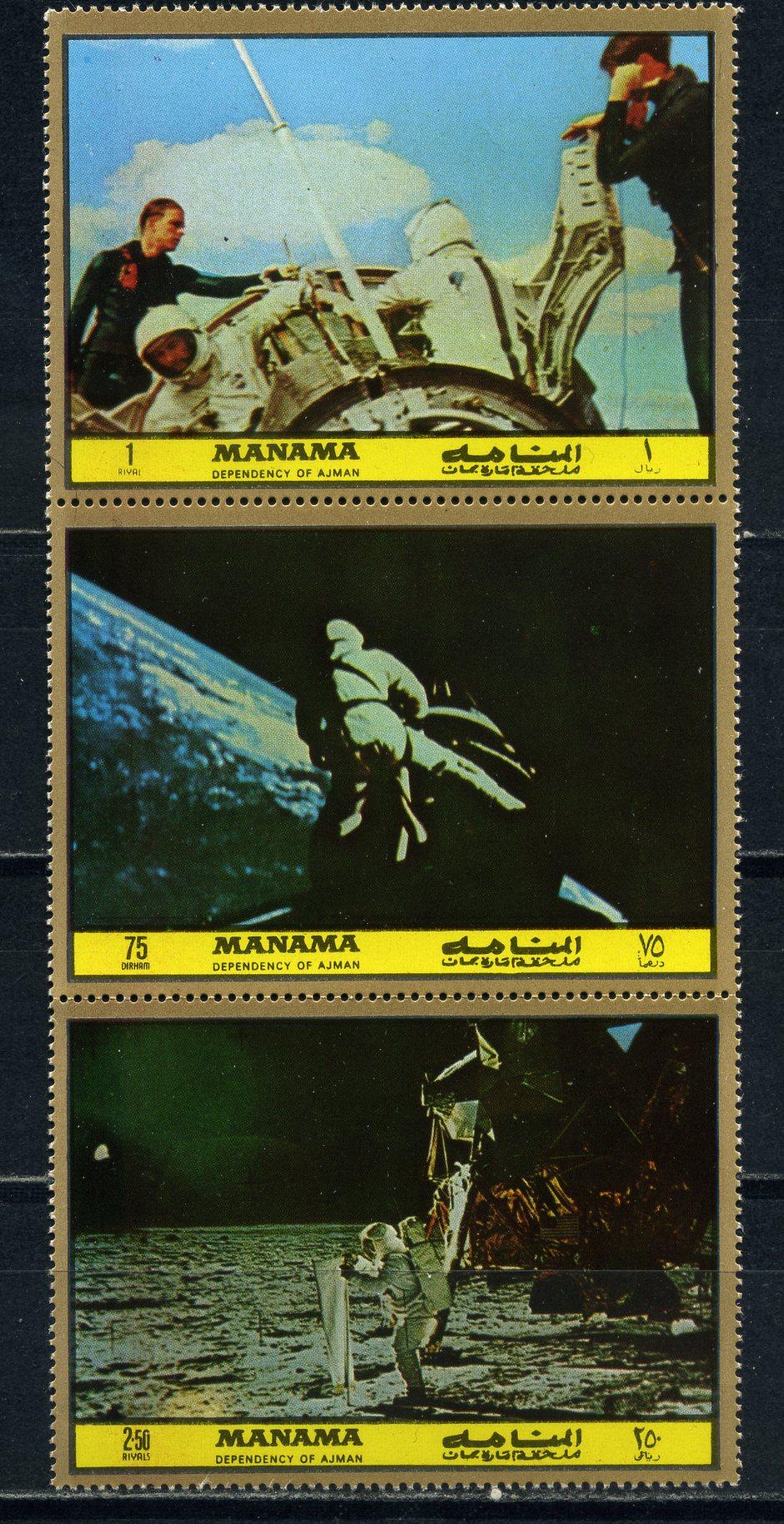 Почтовые марки. Манама. 1972г. Космос. Человек на Луне. №1091-1093.