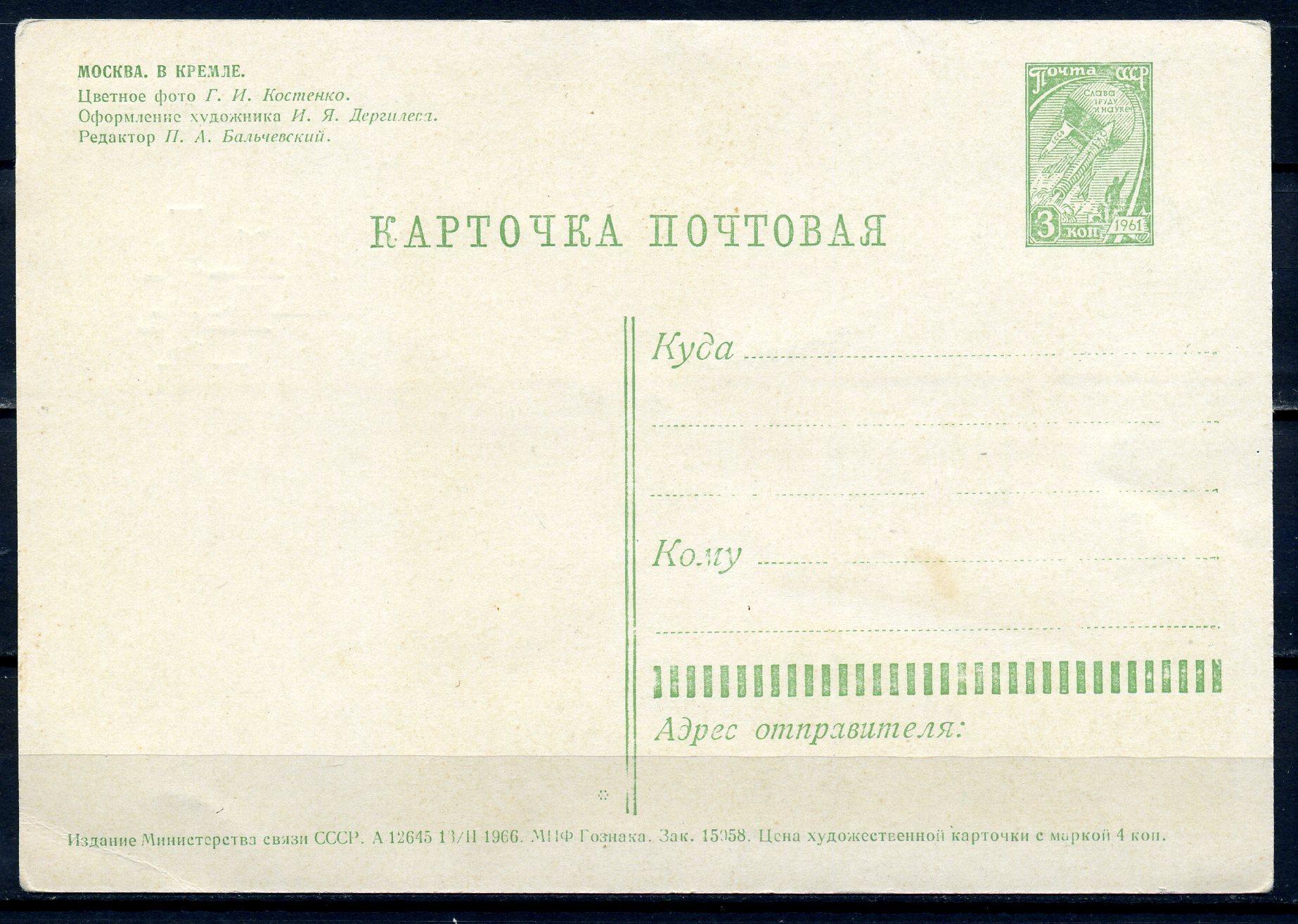 Почтовая карточка. СССР 1966 г. 1 мая. Москва. В Кремле.