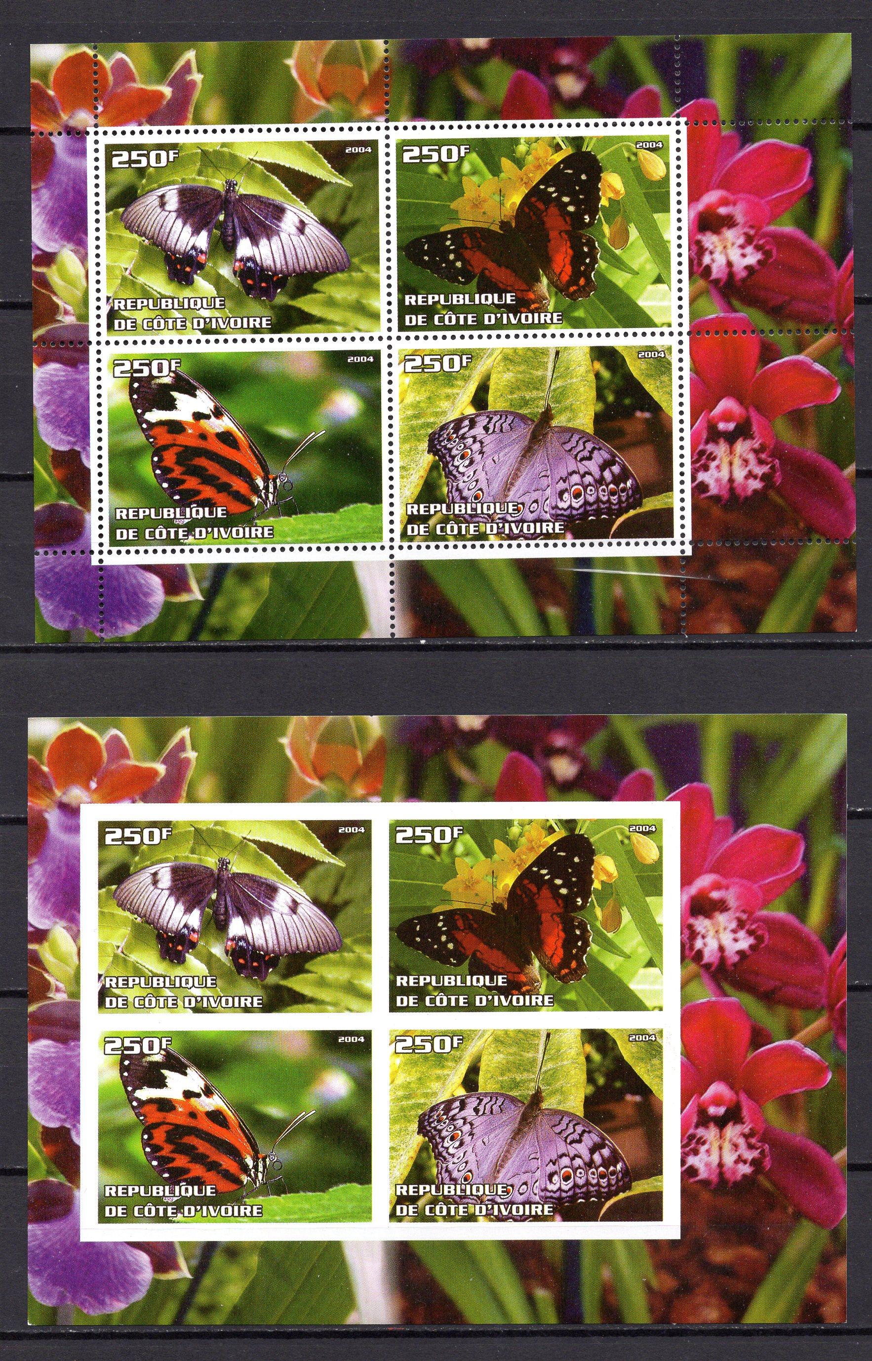 Почтовые марки. Кот-д’Ивуар, 2004 г. Бабочки. Некатал. Безз. и зубц.