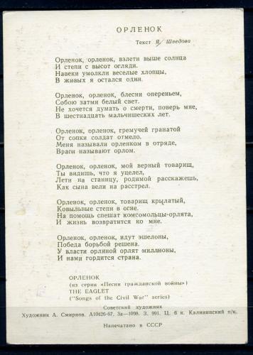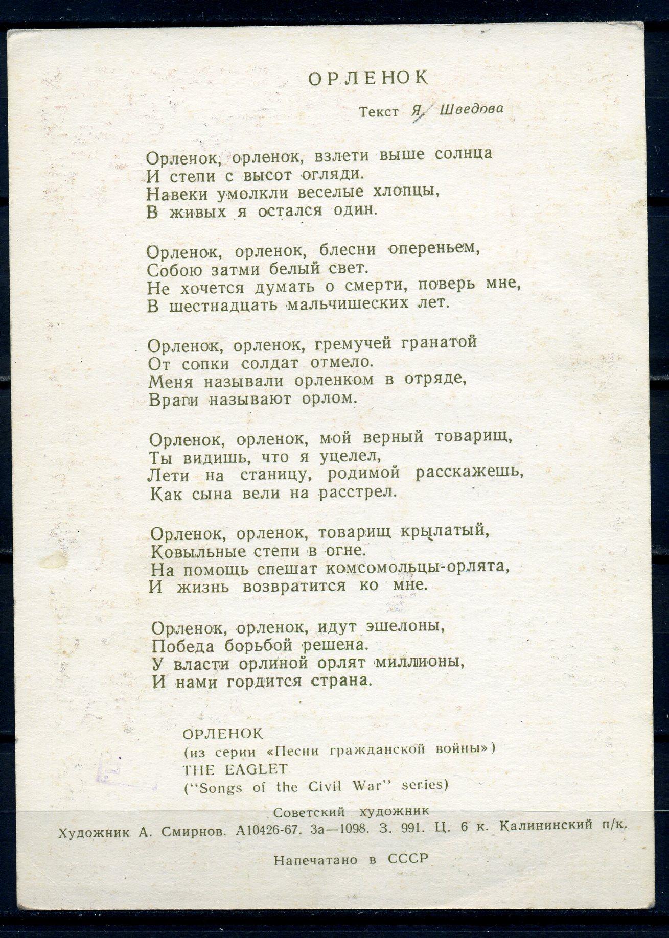 Открытка. СССР 1967 г. Орлёнок (с текстом песни).